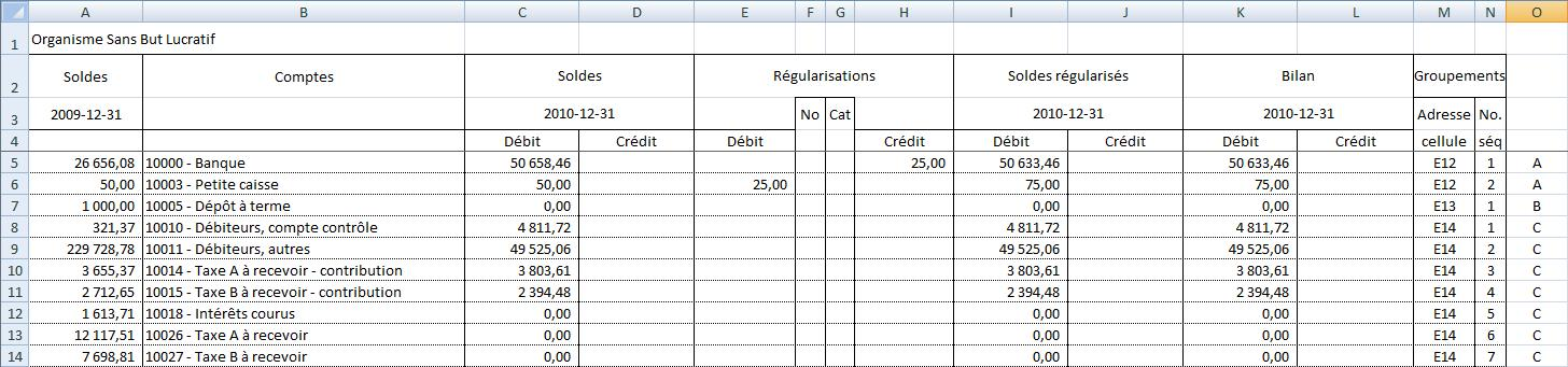 Étant donné qu' Excel travaille avec des adresses de cellules, les groupements de comptes sont identifiés, dans le chiffrier, par des adresses de cellules (colonne M) et par le numéro de séquence du compte dans le groupement d'un poste à l'état financier (colonne N). Les groupements standards en vigueur peuvent être ajoutés dans le chiffrier, par exemple à la colonne O:
