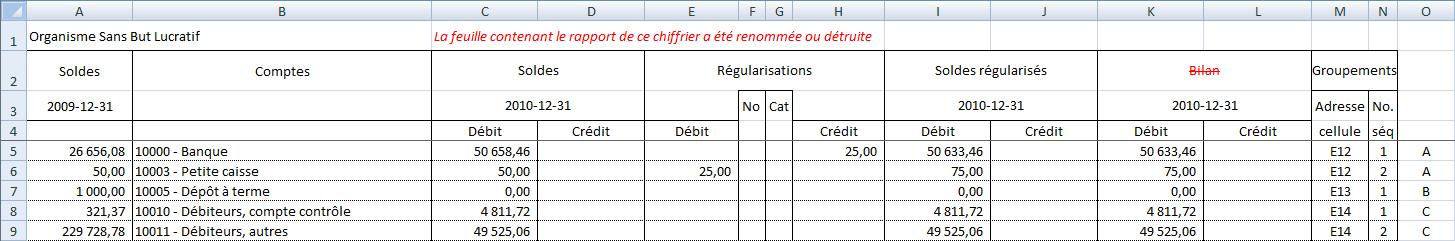 Si la feuille excel contenant l'état financier du chiffrier est enlevée du classeur, cela sera indiqué dans le chiffrier de la façon suivante: