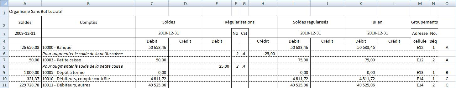 Pour chaque état financier, le Chiffrier contient les soldes de la balance de vérification d'une période précédente sélectionnée (colonne A), la liste des comptes (colonne B), les soldes avant régularisations de la période courante (colonnes C-D), les régularisations (colonnes E-H), les soldes régularisés (colonnes I-J), le nom de la feuille excel de l'état financier (cellule K2), les soldes de l'état financier (colonnes K-L), régularisés ou non régularisés (selon le statut du bouton Soldes régularisés et la sélection de catégories), et les groupements des comptes effectués pour cet état financier (colonnes M-N)