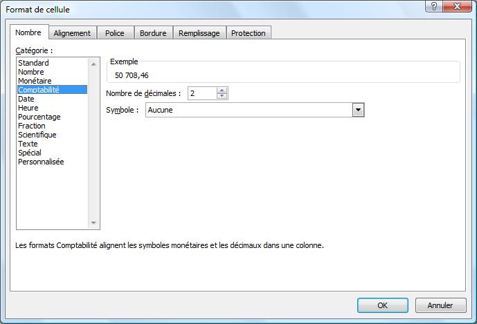 Le format de cellule suggéré pour les soldes est le suivant: 'Comptabilité', 2 décimales, aucun symbole