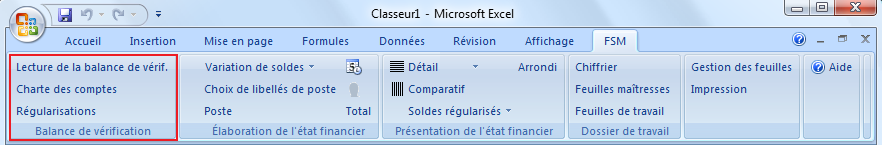 •Lire les données contenues dans le fichier où a été sauvegardée la balance de vérification produite par le logiciel comptable et importer ces données dans ExcelFSM.