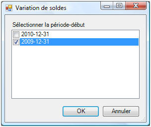 Le bouton Variation de soldes permet de créer un Poste et d'afficher la variation de son solde entre deux périodes (au lieu d'afficher le solde du Poste à une date donnée). Ce bouton est utilisé pour l'élaboration de l'état du flux de trésorerie, des notes aux états financiers et des états financiers intérimaires (trimestriels ou autres). Ce bouton est également utilisé pour tout état financier où il est préférable de créer des colonnes comparatives manuellement (comme décrit ci-bas) plutôt que d'utiliser le bouton Comparatif. Cliquer la flèche à l'intérieur du bouton Variation de soldes puis cliquer Sélection de période(s). La boîte de dialogue Variation de soldes apparaît. Sélectionner la période du début de l'intervalle de périodes désiré pour la détermination de la variation de soldes.