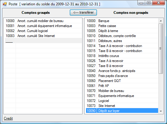 Cliquer sur Poste pour grouper des comptes sous un poste et insérer son solde dans l'état financier: