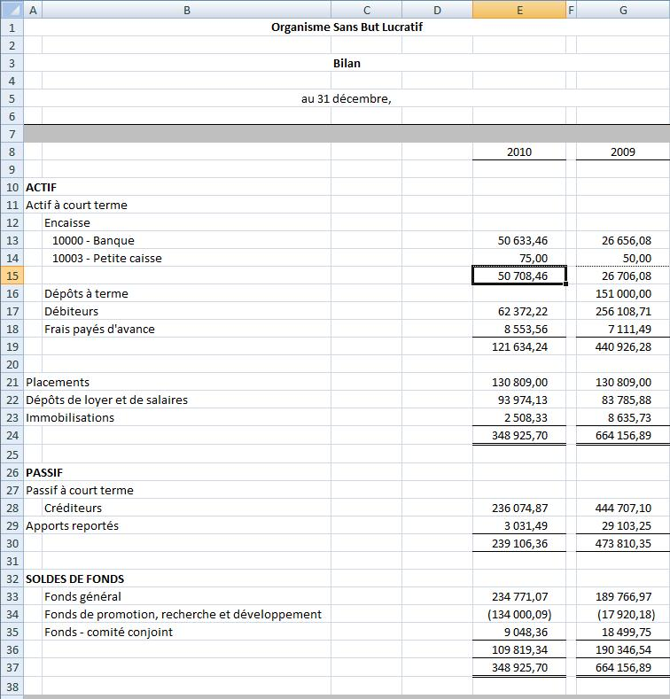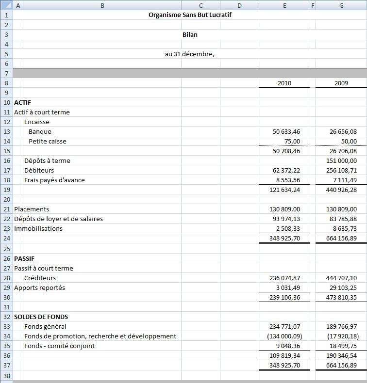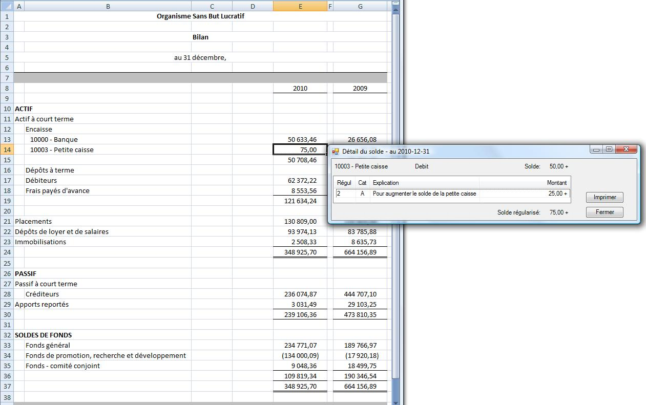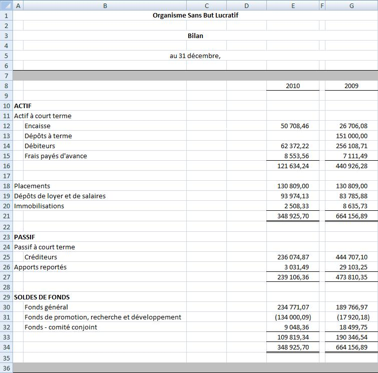 Pour illustrer cette fonction, voici une feuille excel contenant un état financier, avec Détail désactivé, puis avec Détail activé: