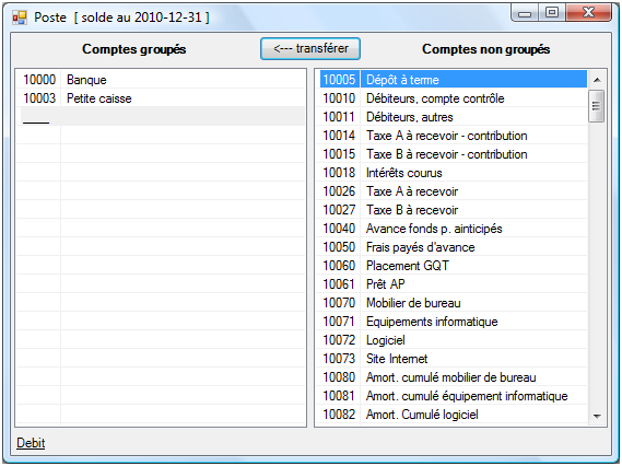 •Cliquer le bouton 'transférer' (ou appuyer la touche entrée) pour transférer le(s) compte(s) sélectionné(s). •Lors du transfert des comptes sélectionnés dans la liste des Comptes non groupés vers la liste des Comptes groupés, les comptes sont tranférés au-dessus du compte sélectionné dans la liste des Comptes groupés. •Lors du transfert des comptes sélectionnés dans la liste des Comptes groupés vers la liste des Comptes non groupés, les comptes sont transférés et remis dans la séquence correspondant à la séquence de la Charte des comptes. •Lors du transfert de comptes, le solde du poste est recalculé, et immédiatement affiché dans la cellule.