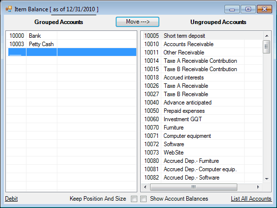 •Click the Move button (or press the Enter key) to move the selected account(s). •When moving account(s) to the Grouped Accounts list, the accounts will be moved above the selected account in the Grouped Accounts list. •When moving account(s) to the Ungrouped Accounts list, the accounts will be placed in the order they are shown in the Chart of Accounts. •When accounts are moved, the Item's balance is re-computed, and displayed immediately in the document.