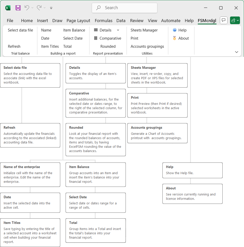 - you select the FSM - Cash Receipts/Disbursements General Ledger data file to associate (link) to an excel workbook,