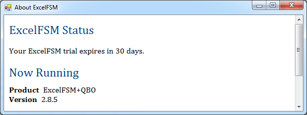 Clicking the ‘About’ button shows the ExcelFSM product and version installed