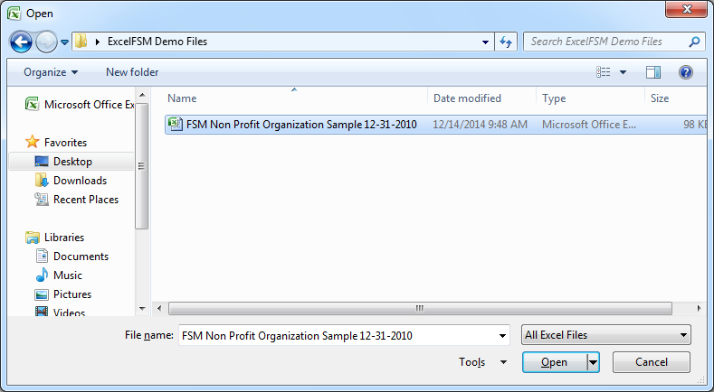 In the demo files, you can refer to the ExcelFSM sample workbook "FSM Non Profit Organization Sample 12-31-2010.xslx".