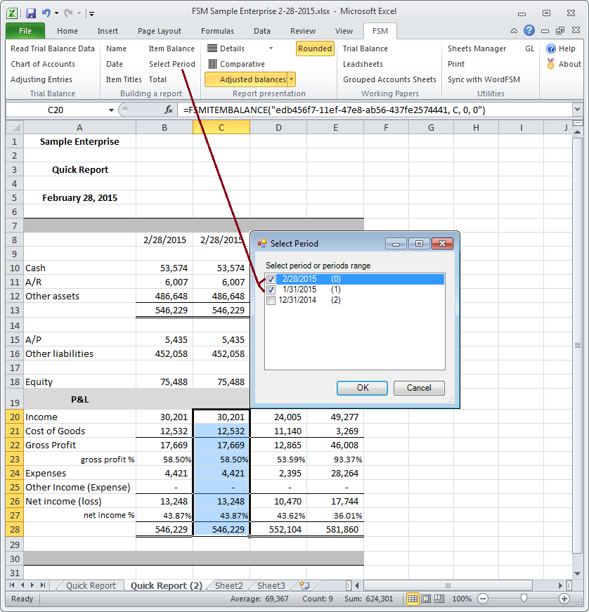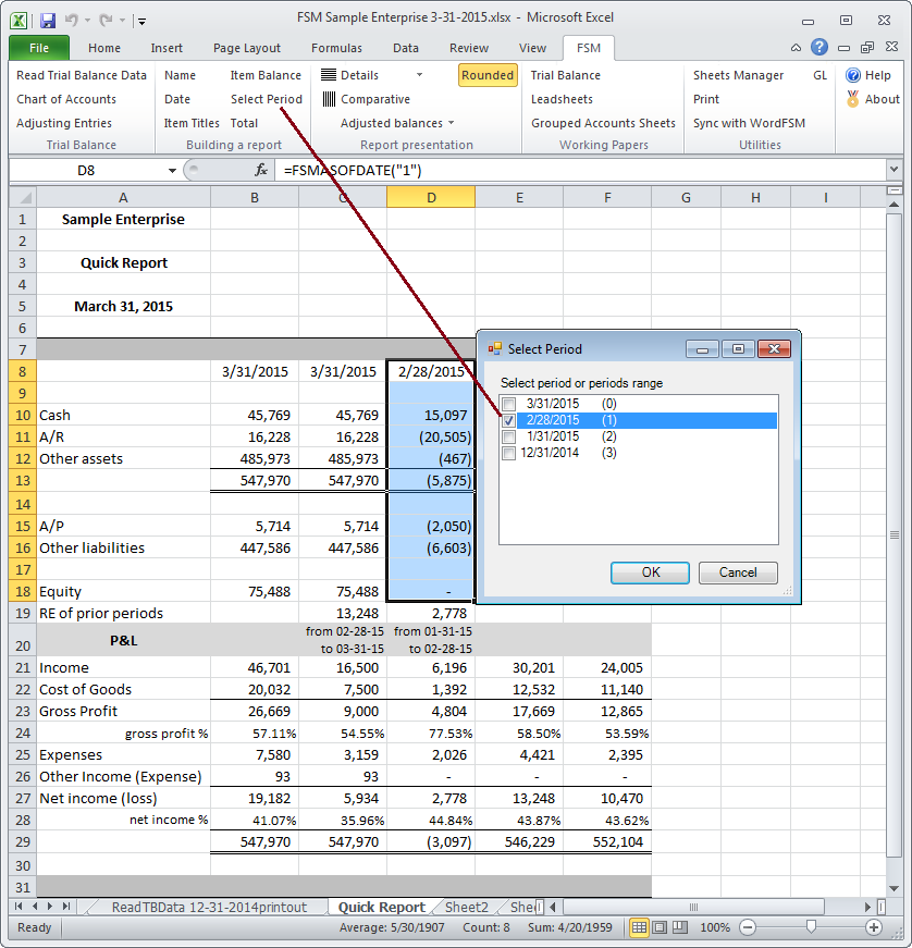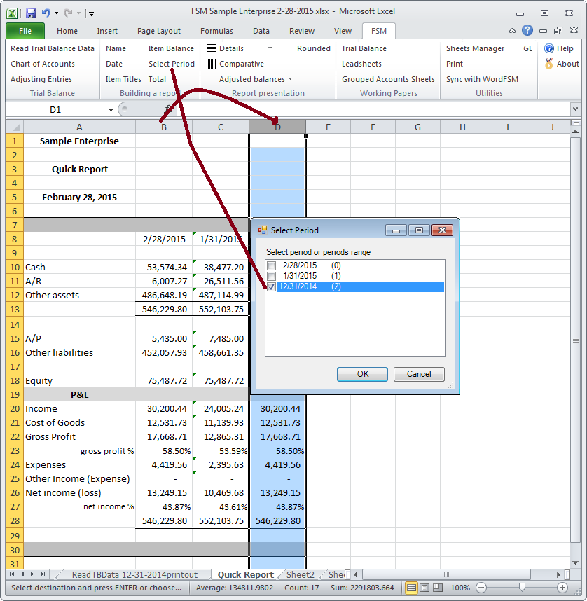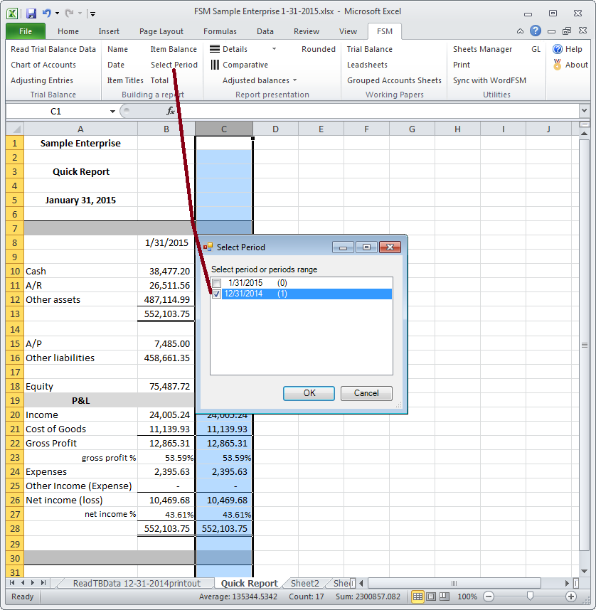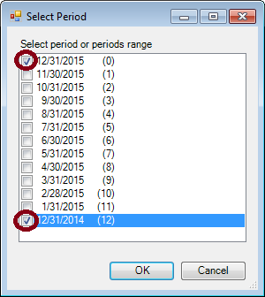 and ‘Select periods’ to reset the first period of current year column (1/31/2015) and the end of prior year column(12/31/2014).
