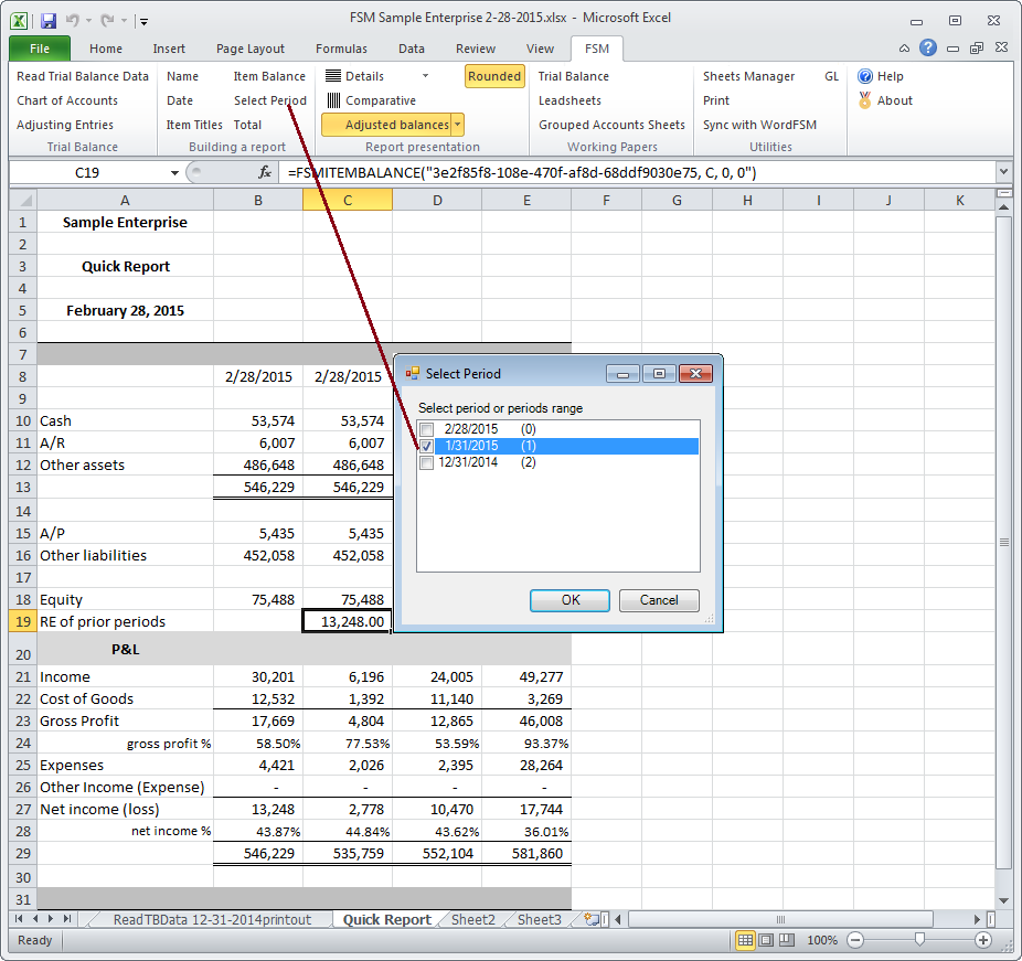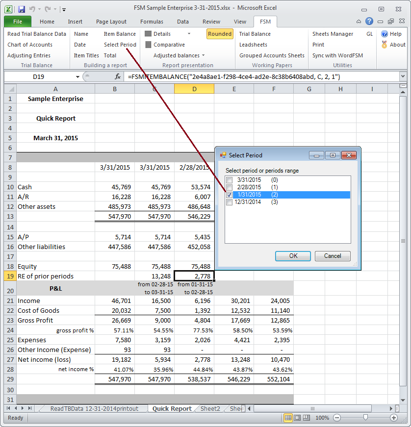 You can keep the end of prior year column(12/31/2014) unchanged from one period to another, by doing Copy&Paste (Paste Values) for the entire column. The drawback is that FSM ‘Details’ button will not work for this column, but you can always get it back to its original, with the FSM formulas, by copying one of the column showing cumulative balances and then doing ‘Select Period(s)’ to set it to the end of prior year as of date.